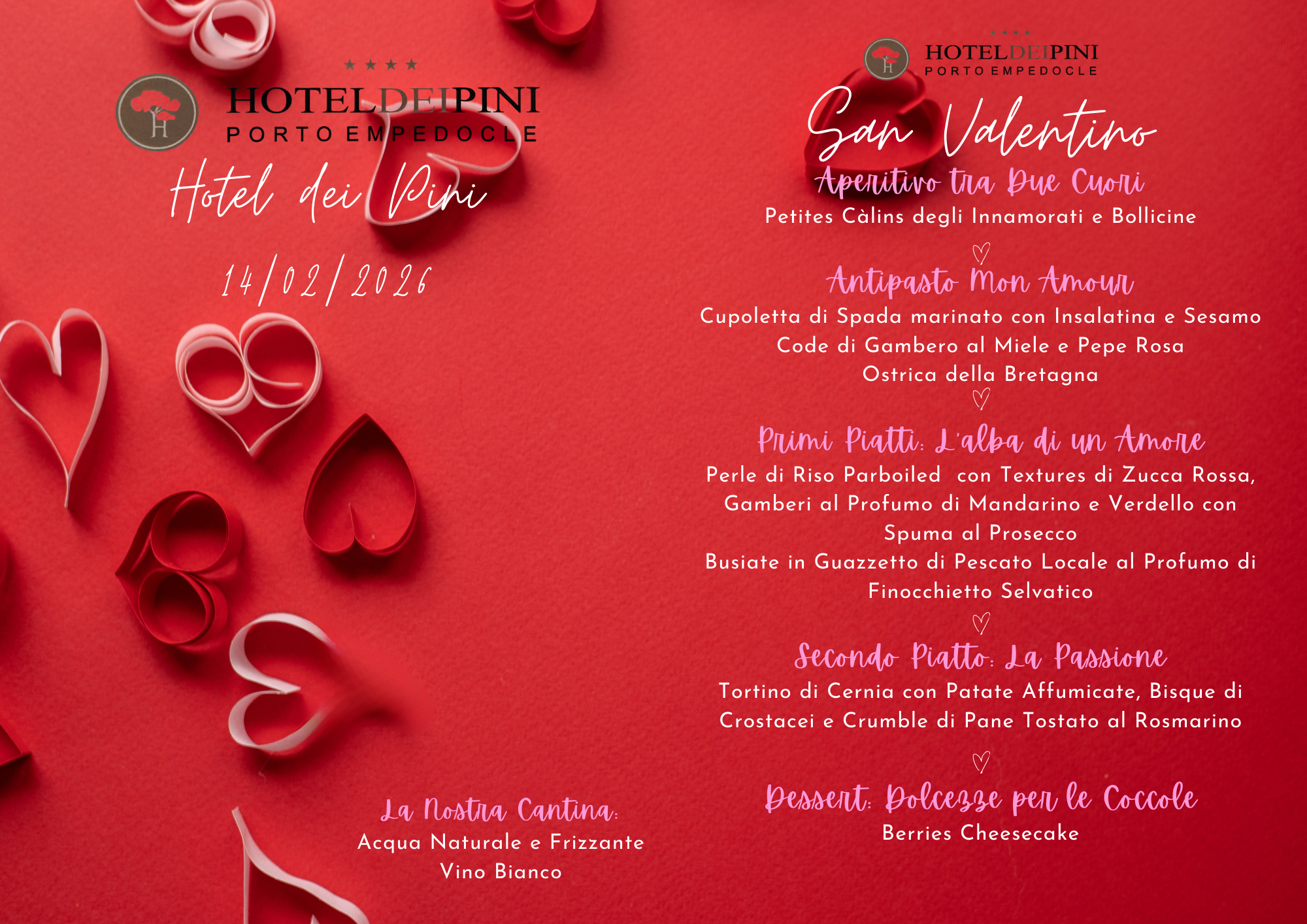 San Valentino per 2 persone con: Cocktail degli Innamorati + Pernotto in Camera Matrimoniale con Petali di Rose, Candele Profumate e Spumante + Cena a Lume di Candela con Musica Soft + Colazione del Giorno Dopo + Pranzo degli Innamorati del Giorno Dopo